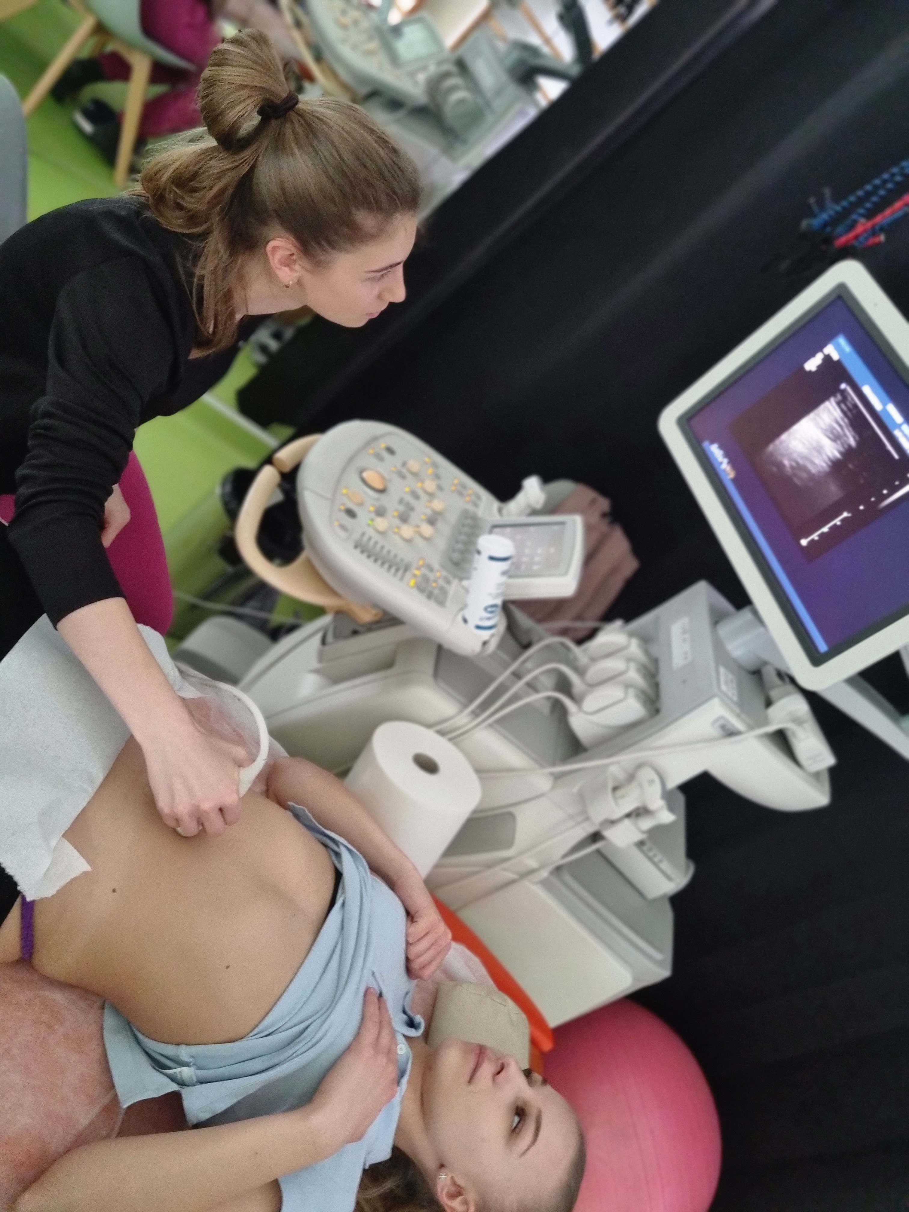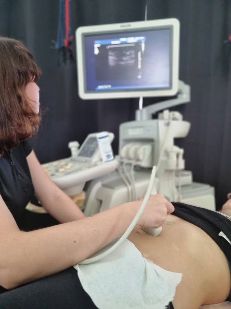 praktyka (badanie)- badanie w ujęciu osteopatycznym, badanie manualne wg standardów IFOMPT, podstawy badania USG (badanie powłok jamy brzusznej i struktur dna miednicy) oraz EMG